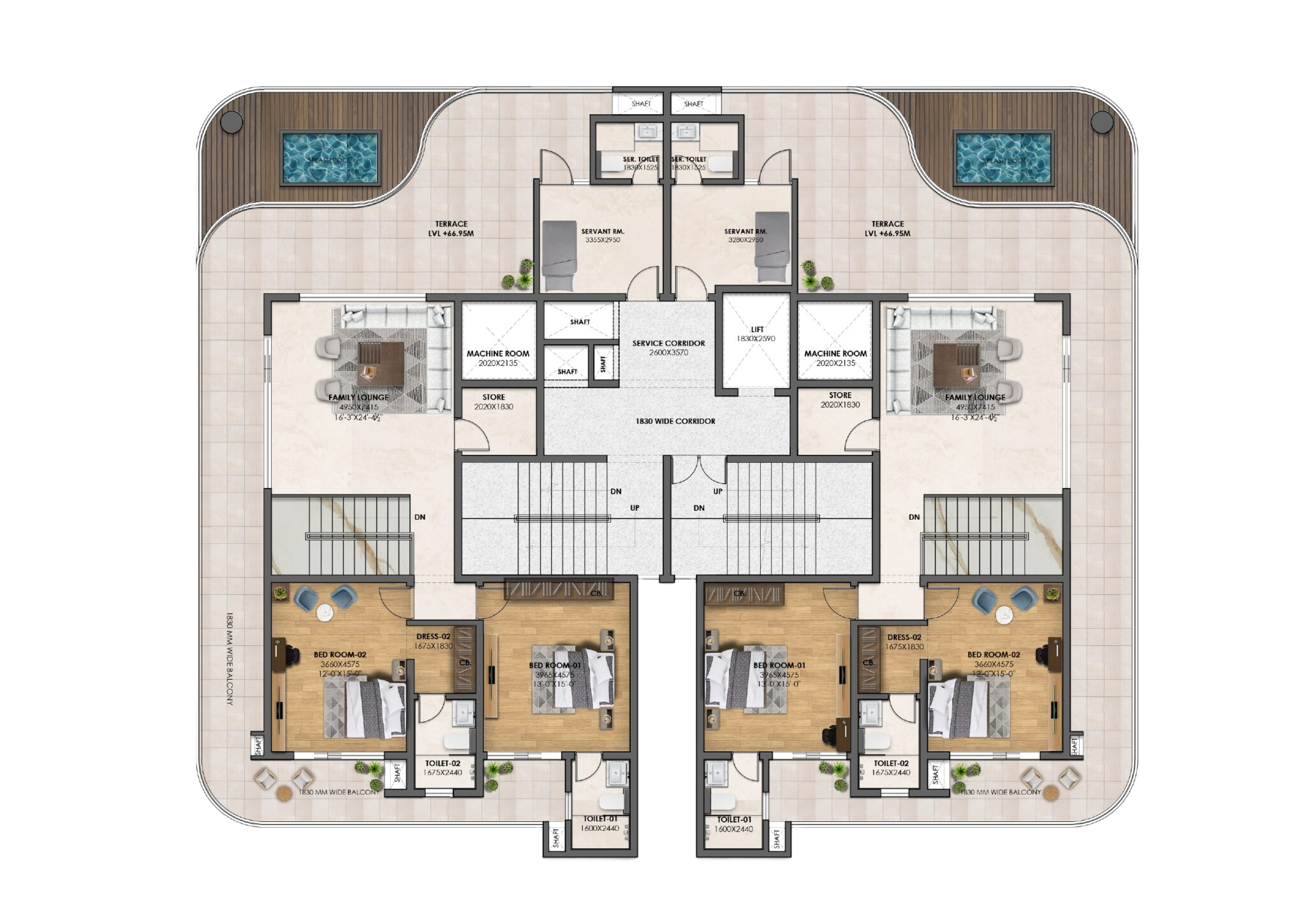 Wraparound balconies with open views.